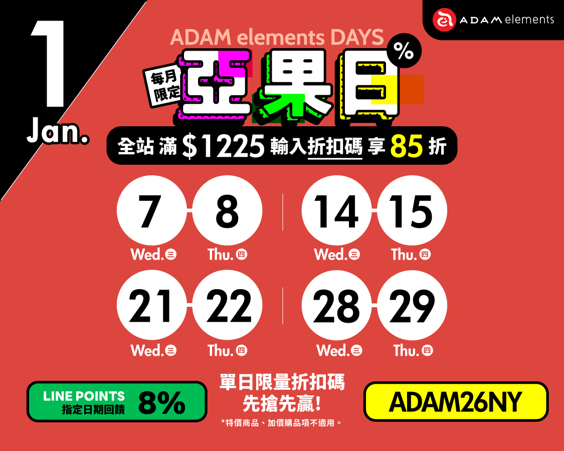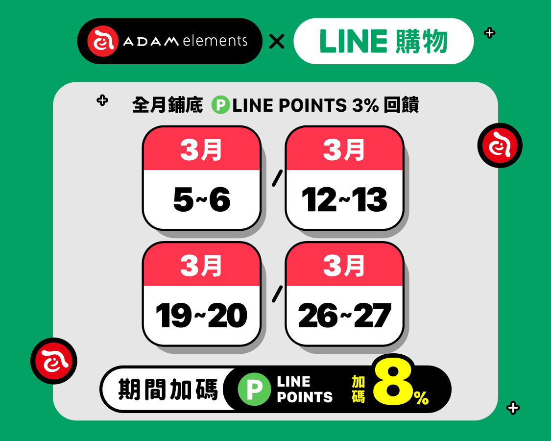 ADAM × LINE購物 全館優惠再回饋 ➜ 指定日期最高加碼8%