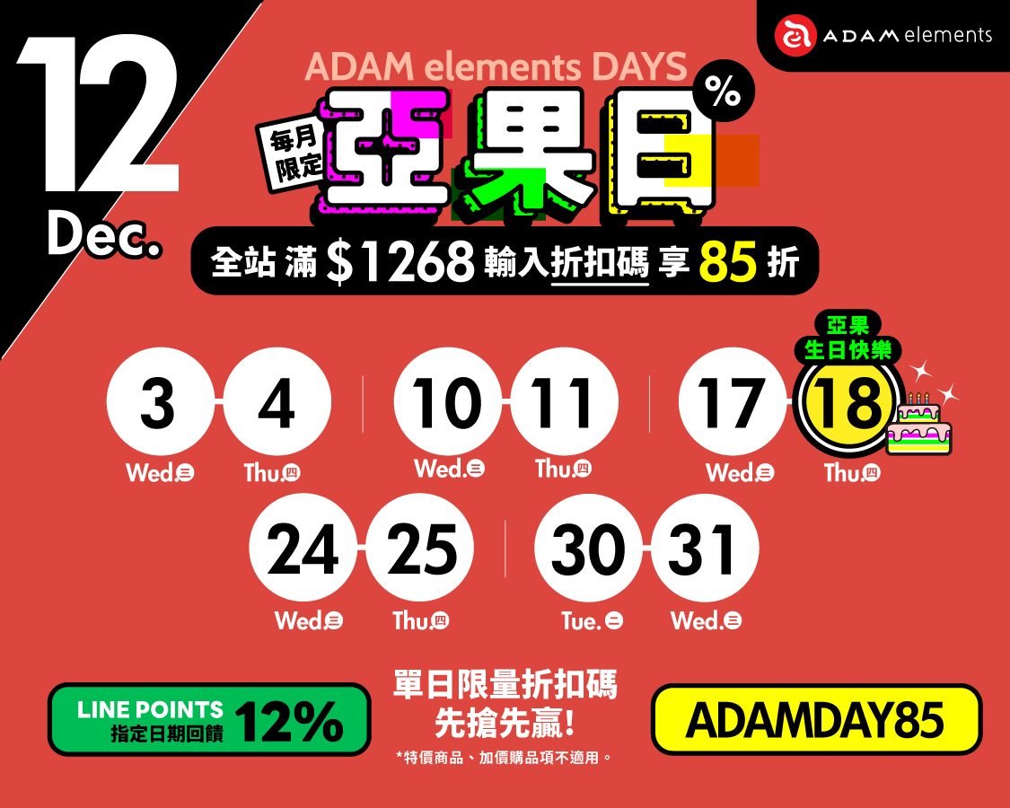 全館滿額再享85折 / 折扣碼在這 ▶『ADAMDAY85 』