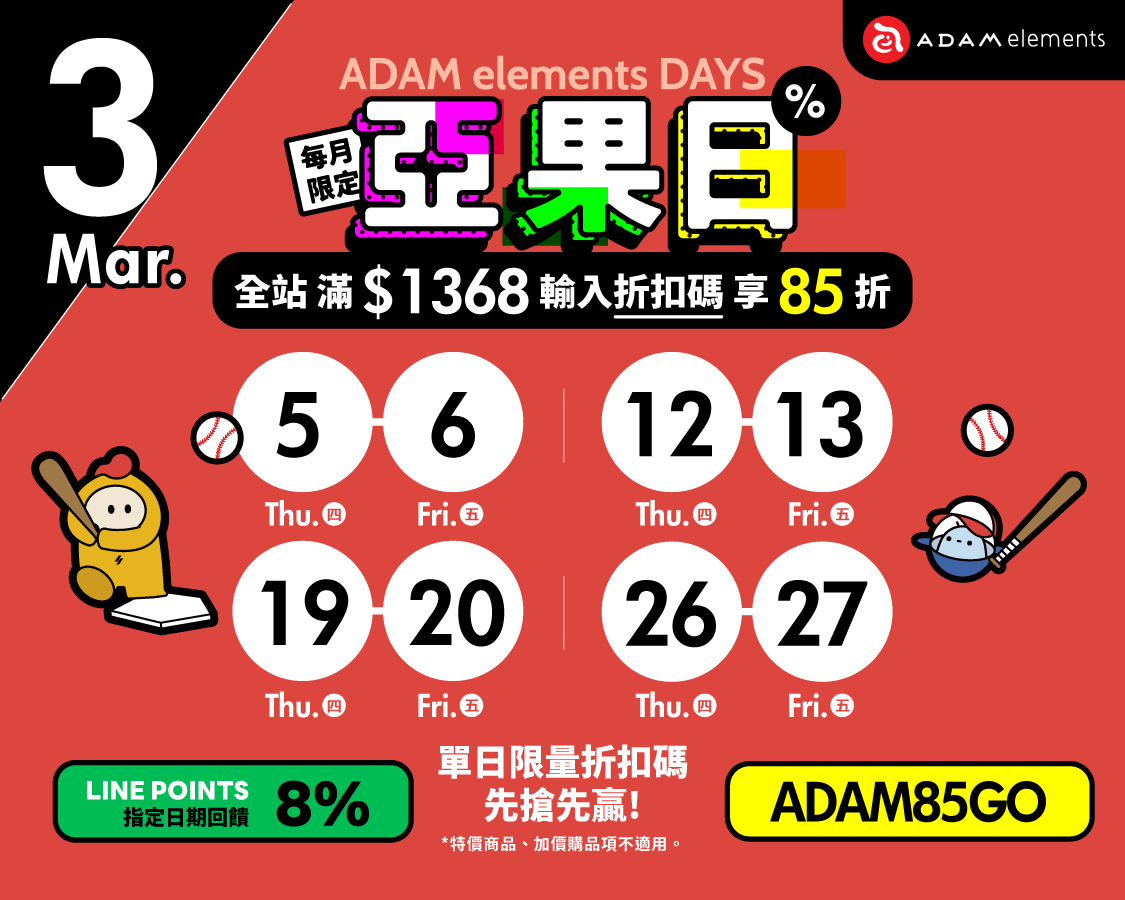 全館滿額再享85折 / 折扣碼在這 ▶『ADAM85GO』