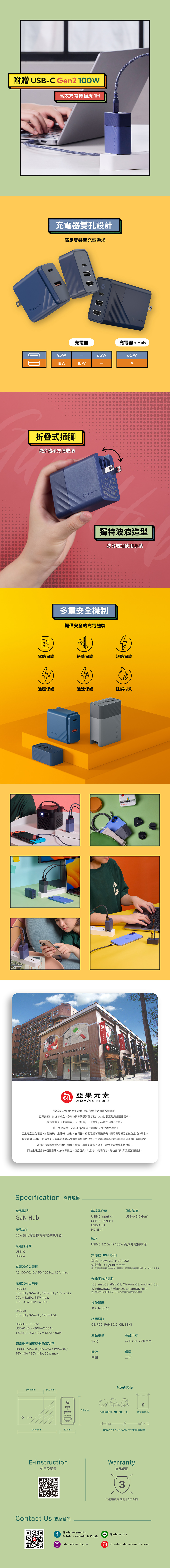 【65W GaN 快充】應用氮化鎵快充技術,支援PD3.0 65W充電。單獨使用充電器 USB-C 單孔可輸出最高65W;兩孔同時充電時,USB-C支援最高45W,USB-A支援最高18W。結合集線器時,USB-C 最高可支援 60W 充電速度,USB-A 孔為資料傳輸使用,支援 5Gbps 資料傳輸速度。