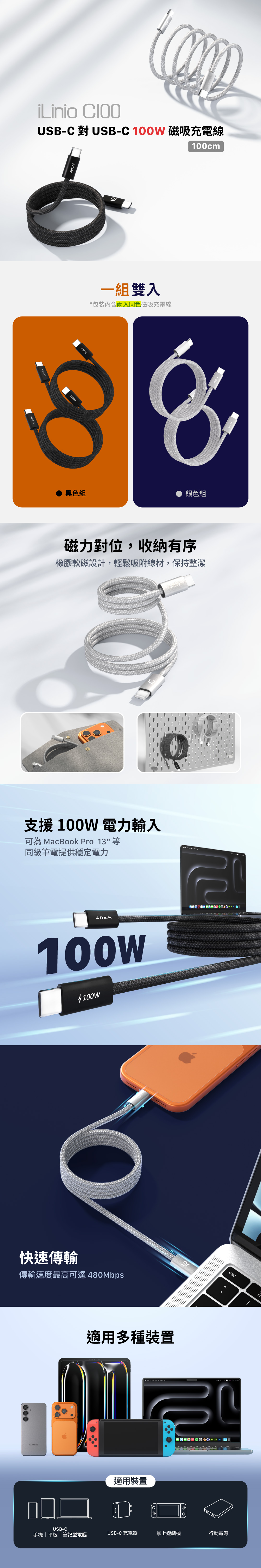 ❃ USB-C 對 USB-C 100W 磁吸充電線。