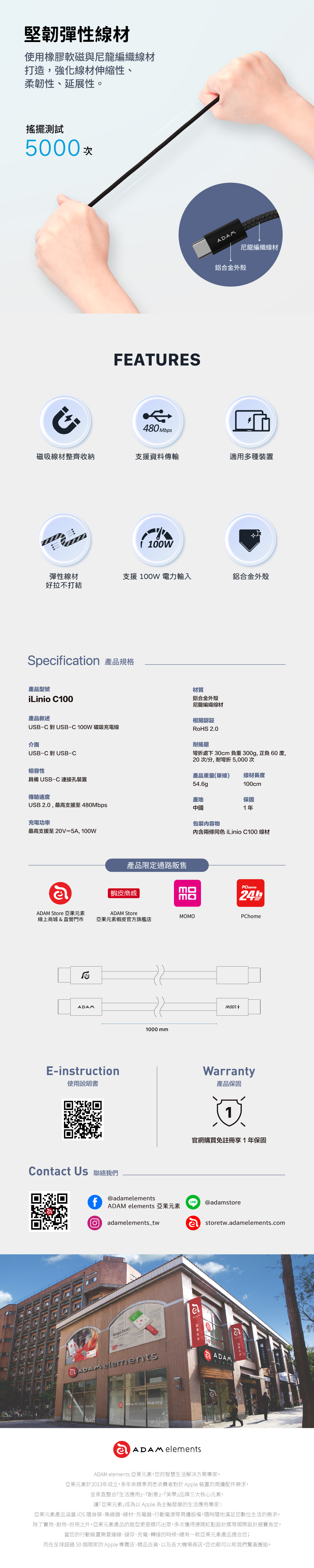 ❃ 可充電與資料傳輸,支援電源輸出:Max 100W(20V, 5A);傳輸速度:USB 2.0, 480Mbps。