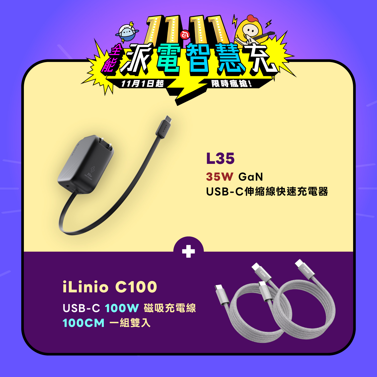 iLinio C100 USB-C 100W 磁吸充電線 (一組二入)